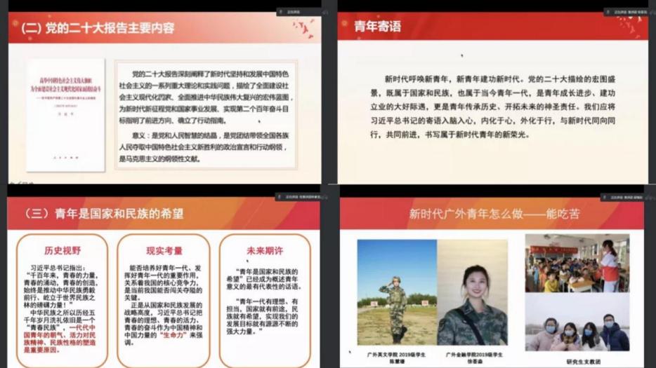 深学细悟党的二十大精神,争做新时代好青年。宣讲团成员万东方、宗思羽、林家玄、梁煊彤作题为“深学细悟党的二十大精神,做有理想、敢担当、能吃苦、肯奋斗的新时代好青年”的宣讲。围绕“深学党的二十大精神”“党代会报告关于青年工作的论述”“为什么党代会如此重视青年工作”“践行党的二十大精神,立志做新时代好青年”四个方面展开,号召广外青年感悟知识的力量、体现奋斗精神、践行“明德尚行,学贯中西”的校训、勇于做走在时代前列的奋进者、开拓者、奉献者。
