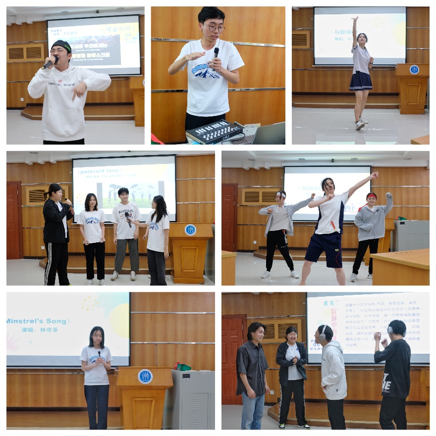 在欢迎会上,中国学生林彦莘以及张衡、尹绚、安妮、张栩玥、叶馨桐五人组分别献唱了日语、韩语抒情歌曲《Minstrel’s Song》和《Ploariod Love》,刘贝贝则带来了宅舞表演《与你同行》,陈昊文演奏了自己作曲的电子音乐《School Time》。韩国留学生吴旻烨为带来了一首轻松欢快的韩国唱跳歌曲,日本留学生则跟随着欢快优雅的日本舞曲表演了日本传统舞蹈《SORAN節》。最后,全体学子合唱的中日双语歌曲《十年》。