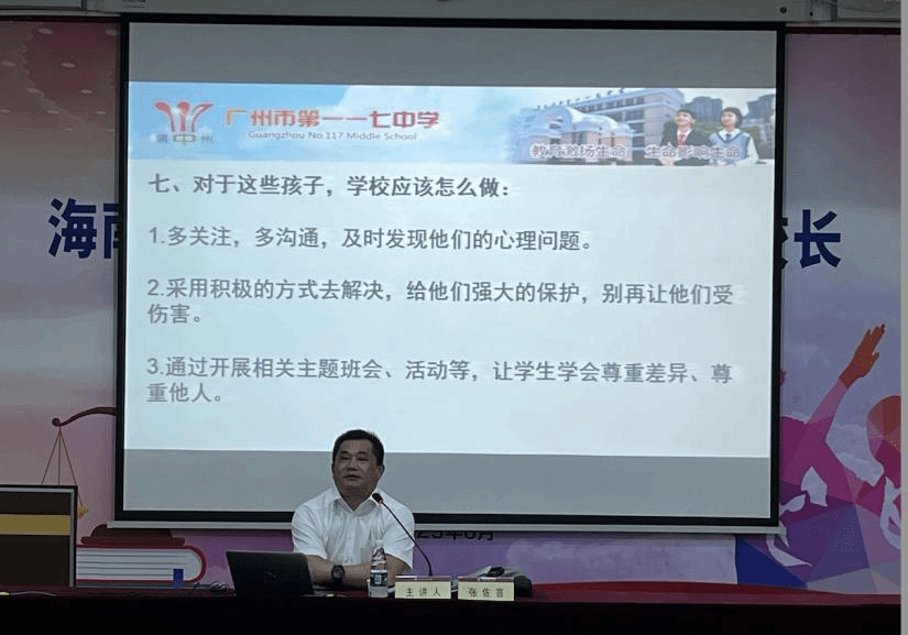 广州市海珠区万松园小学副校长刘玉霞、广州市第117中学校长张佐言来到培训现场,与学员分享了各自学校近些年来法治教育工作经验和成果。刘玉霞与大家分享了万松园小学着力建设"1+N"法治宣传阵地,定期举办普法活动,打造沉浸式普法环境的做法和经验。张佐言以“用规则守护校园,对校园欺凌说不!”为题,分析了当前校园欺凌的种种现象和原因,介绍了学校如何运用法治思维和法治手段,预防和减少校园欺凌的有效做法。