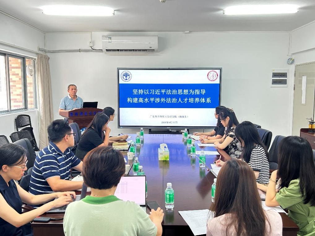 杨敏生分享了学习习近平法治思想的心得体会,介绍了学院当前涉外法治人才培养的模式与成效、存在问题不足以及接下来的努力方向,展望了本硕博“小语种+法学”涉外法治人才培养需求,希望学院之间进一步发挥“法学+外语”的学科优势,创新人才培养模式,创建涉外法治教学、科研、教师合作、服务机制等方面的新平台,联合创建“多语种涉外法律服务中心”,在助力广东实现高质量发展走在全国前列和法治中国建设贡献广外“小语种+法学”力量。