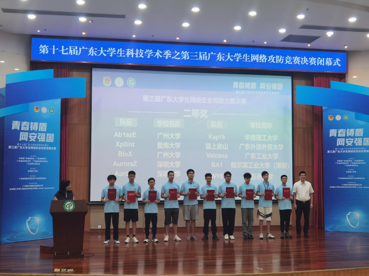 本网讯 6月2日,由共青团广东省委员会、广东省教育厅、广东省科学技术厅、广东省科学技术协会、广东省学生联合会主办的第三届广东大学生网络攻防竞赛决赛圆满收官。伟德bv国际体育信息学院网络空间安全专业宋皓、陈尚维、邓轩翔等三位本科生组成的“广外幽灵战队”以超过第二名近1万分的成绩勇夺冠军。此外,信息学院网络空间安全专业张裕凡、李子彦、吴晨阳、徐隽扬等四位本科生组成的“猫上梁山战队”荣获二等奖。