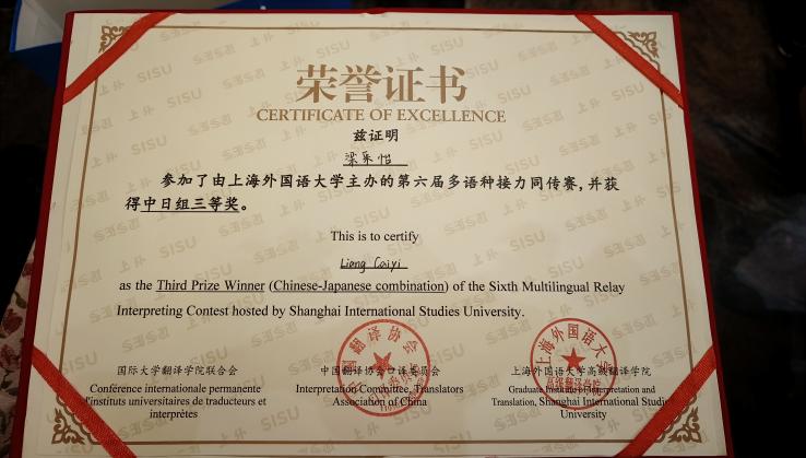 本网讯 近日,由中国翻译协会(TAC)口译委员会、国际大学翻译学院联合会(CIUTI)、上海外国语大学主办的第六届多语种接力同传赛总决赛圆满落幕。来自全球知名院校的128名选手参加了总决赛的角逐。伟德bv国际体育日语口译研究生梁采怡同学历经初赛、复赛层层选拔,以熟练的翻译技巧、准确的词汇运用、沉稳从容的临场表现,展现了广外学子出色的专业技能,最终荣获本次大赛三等奖。