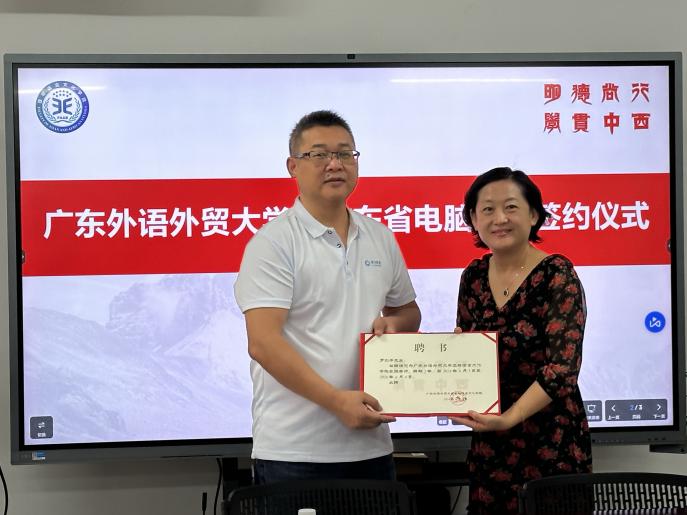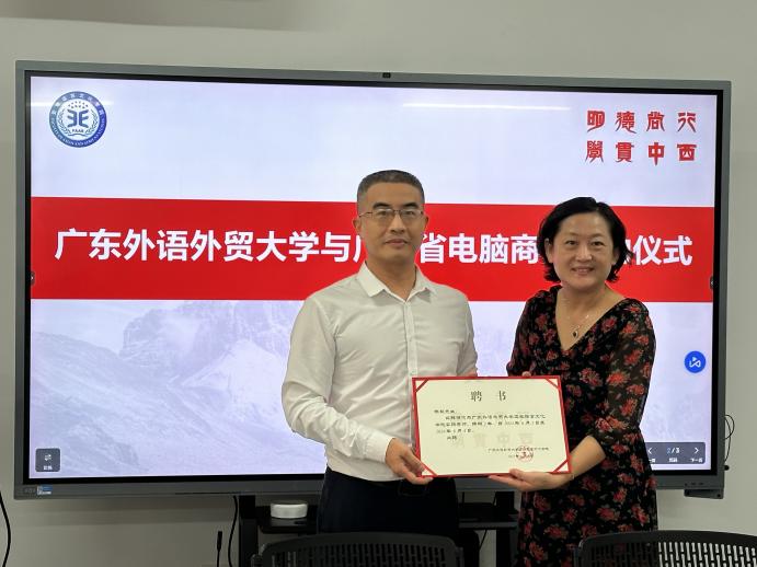 亚非学院院长全永根和马本湘分别介绍了广外和商会的情况,就未来合作方向展开讨论并签约合作协议。双方将共同推动“一带一路”国家倡议,为出海“一带一路”沿线国家的广东企业提供语言和咨询等社会服务,合作开展人才培养及建立海内外实习实践基地,积极探索校企联合培养创新型、实用型人才的新模式,搭建适应企业发展需求的人才输送渠道,实现资源共享,实现企业与高校在小语种人才培养模式选择、教学方法改革、提高学生实践能力等方面更广泛的合作。协议签署仪式后,全永根向马本湘颁发学院客座教授聘书,梁洁向熊昊、陈玖罗、剑芳颁发学院校外实践导师聘书。