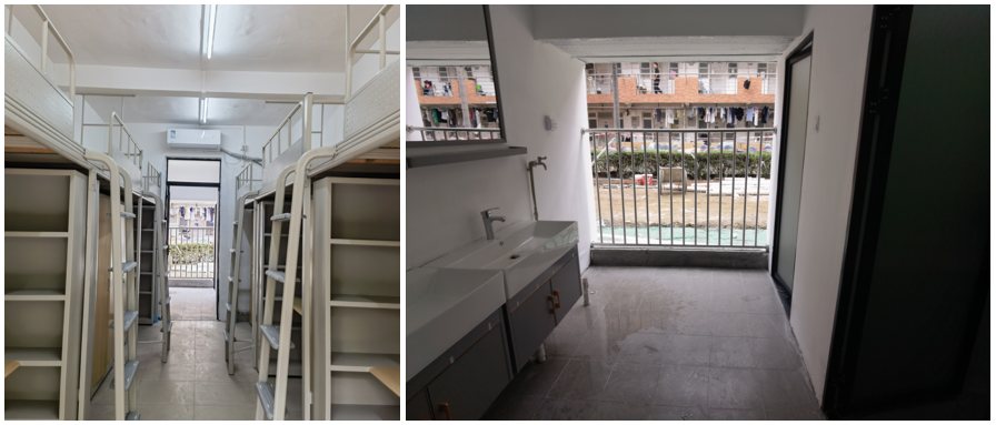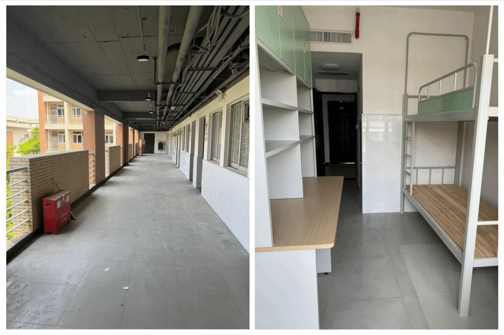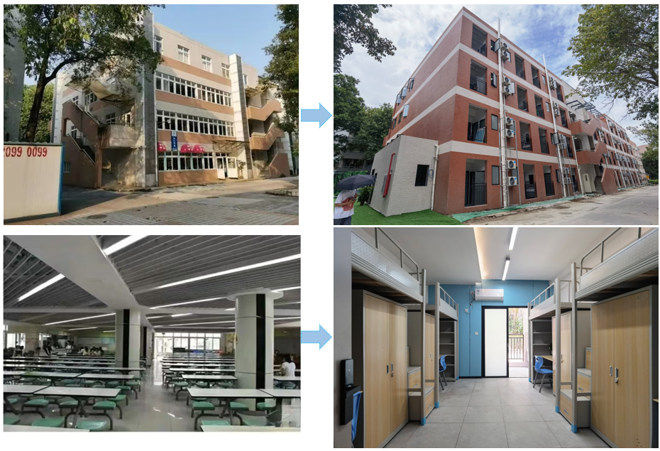 暑期实施的学生宿舍的项目不仅增加了学生床位、满足了校区调整的需要,且让学生宿舍从内到外焕然一新。为保障校区调整的学生顺利入住,基建部迅速响应,对白云山校区宿舍17栋与大学城校区宿舍1栋、13栋的173间宿舍进行翻新,提前交付使用,为紧张的校区调整工作争取了宝贵的时间。白云山校区学生宿舍20栋修缮项目将原财院第三饭堂改造成学生宿舍,调整内部布局、翻新外立面、更换门窗水电线路,为学校新增了64间宿舍,256个床位。宿舍7栋项目将48间学生宿舍由公共卫生间升级为独立卫生间和阳台,室内布置上床下桌。宿舍4栋项目则将1218个高而不便的高柜调整为触手可及的上床下桌。大学城学术交流中心项目新增了学生饭堂,将学术交流中心改造为学生宿舍,翻新了走廊等公共区域。校区友苑A、B栋修缮项目对383间宿舍内布局调整,走廊与宿舍室内墙面贴砖,卫生间修缮等。新的宿舍设施更齐全、环境更舒适、布局更合理、氛围更温馨。