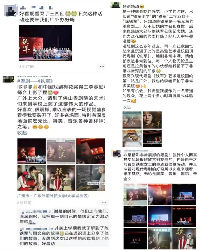 现代粤剧《铁军》以“100位为新中国成立做出贡献的英雄模范人物”、佛山本土革命烈士陈铁军为原型,以陈铁军烈士的成长故事为主线展现一位富家闺秀蜕变成为革命战士的成长历程,展现出革命烈士陈铁军英雄儿女的精神气概,更体现了中国近代革命历史上青年人的价值取向和使命担当。动人心魄的剧情,深深打动、感染鼓舞现场观众。演出结束后,主创团队及演员老师们与现场观众分享作品创作过程中的故事与心得。观众互动问答环节,伟德bv国际体育学生积极参与,表达了对粤剧文化创新传承的极大好奇和兴趣。