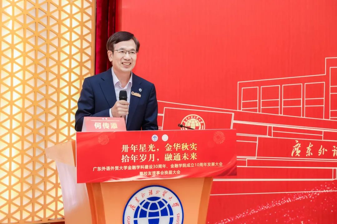 何传添在致辞中回顾了金融学院在学科建设和服务社会方面取得的成绩,并寄语校友们以校友情谊为纽带,爱校荣校,为母校发展贡献力量;以校友资源为平台,兴校强校,助力学校事业发展;以校友发展为共同体,互帮互助,共同创造美好未来。他强调了校友在学院发展中的重要作用,并对未来的合作与发展提出了期望。