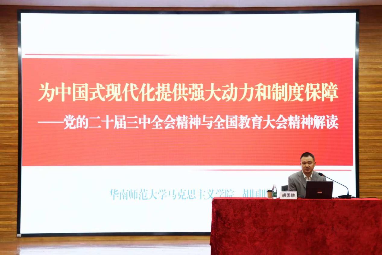 本次会议还邀请了华南师范大学马克思主义学院党委书记胡国胜教授以《为中国式现代化提供强大动力和制度保障——党的二十届三中全会精神与全国教育大会精神解读》为题作讲座,围绕《中共中央关于进一步全面深化改革、推进中国式现代化的决定》和习近平总书记在全国教育大会上的重要讲话,对进一步全面深化改革、全面推进教育强国建设等内容进行了深入讲解和系统阐释。