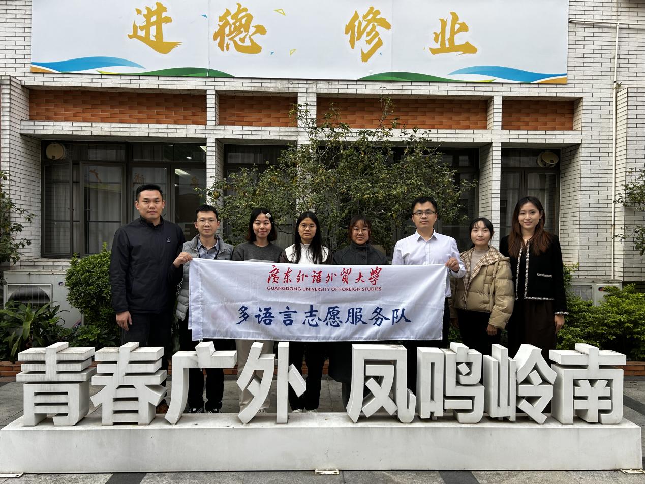 李冉(左)、戴怡馨(右)与外宾交换广外校徽