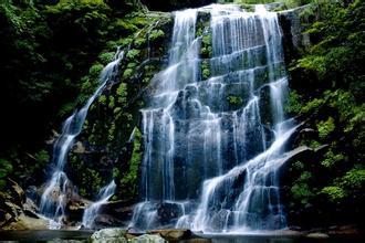 走着走着,一扇狭窄的石门拦在眼前,说到石门,原来是石梯的两端各长了两块巨石,小朋友站在石梯上都可以一夫当关万夫莫开。穿过石门,听到轰隆轰隆的水声,溪水在山中腰的这一段因为海拔的增高形成了一条曲曲折折的瀑布,远看似一匹绸缎,近听水声有雷霆万钧之势。瀑布落在下面的水潭里,形成千万朵水花,在潭水的表面上旋转,碰撞,最后变成一个个细小的漩涡融进那绿森森的潭水里。潭的中央有一块圆形的巨石,很多的游人绕过潭水,爬上巨石去戏水,拍照。太阳明晃晃地照在潭水和石头上,虽然照得热,但是潭水清冽,溅在身上就是三伏天都要打一个冷战。