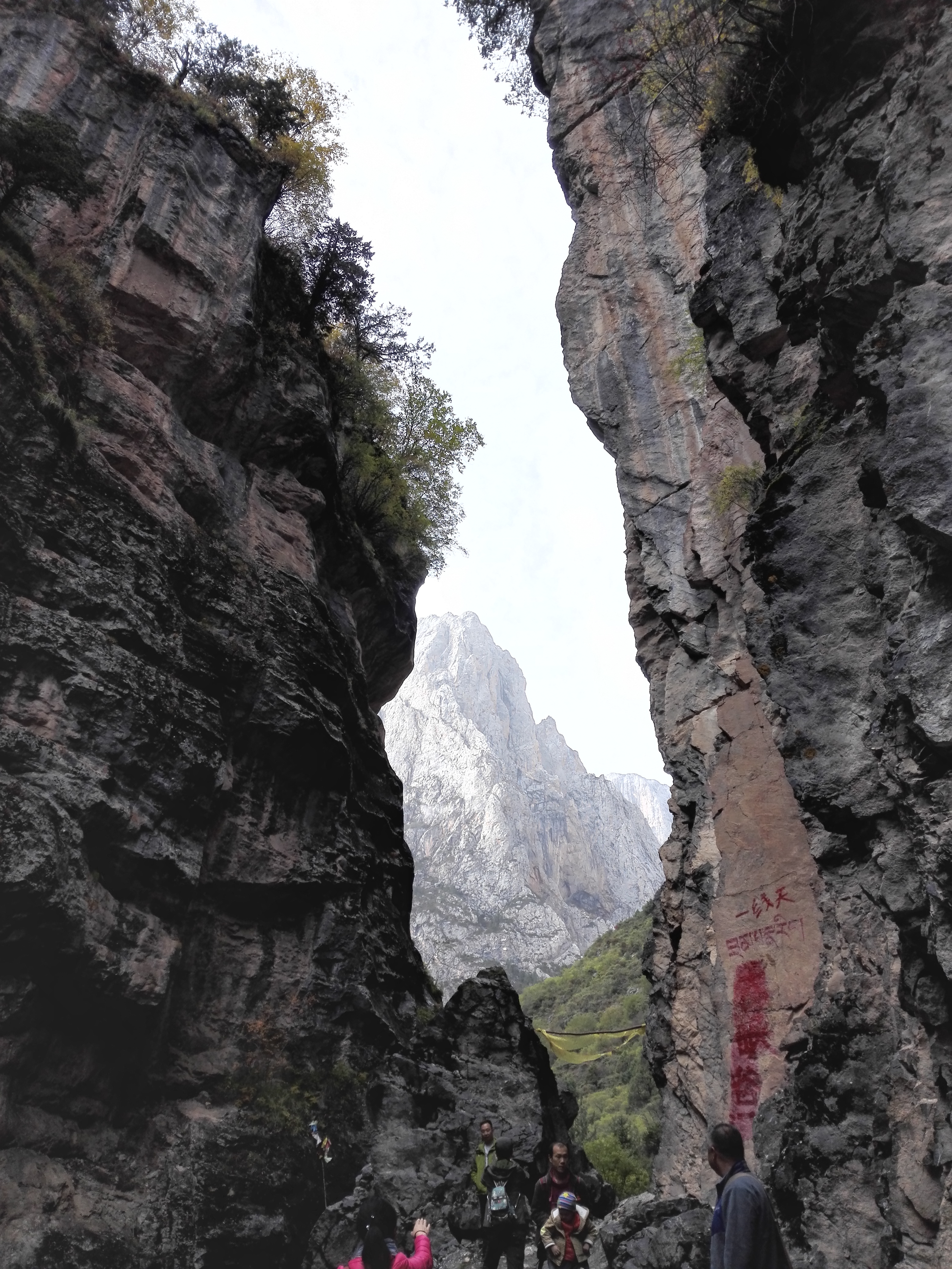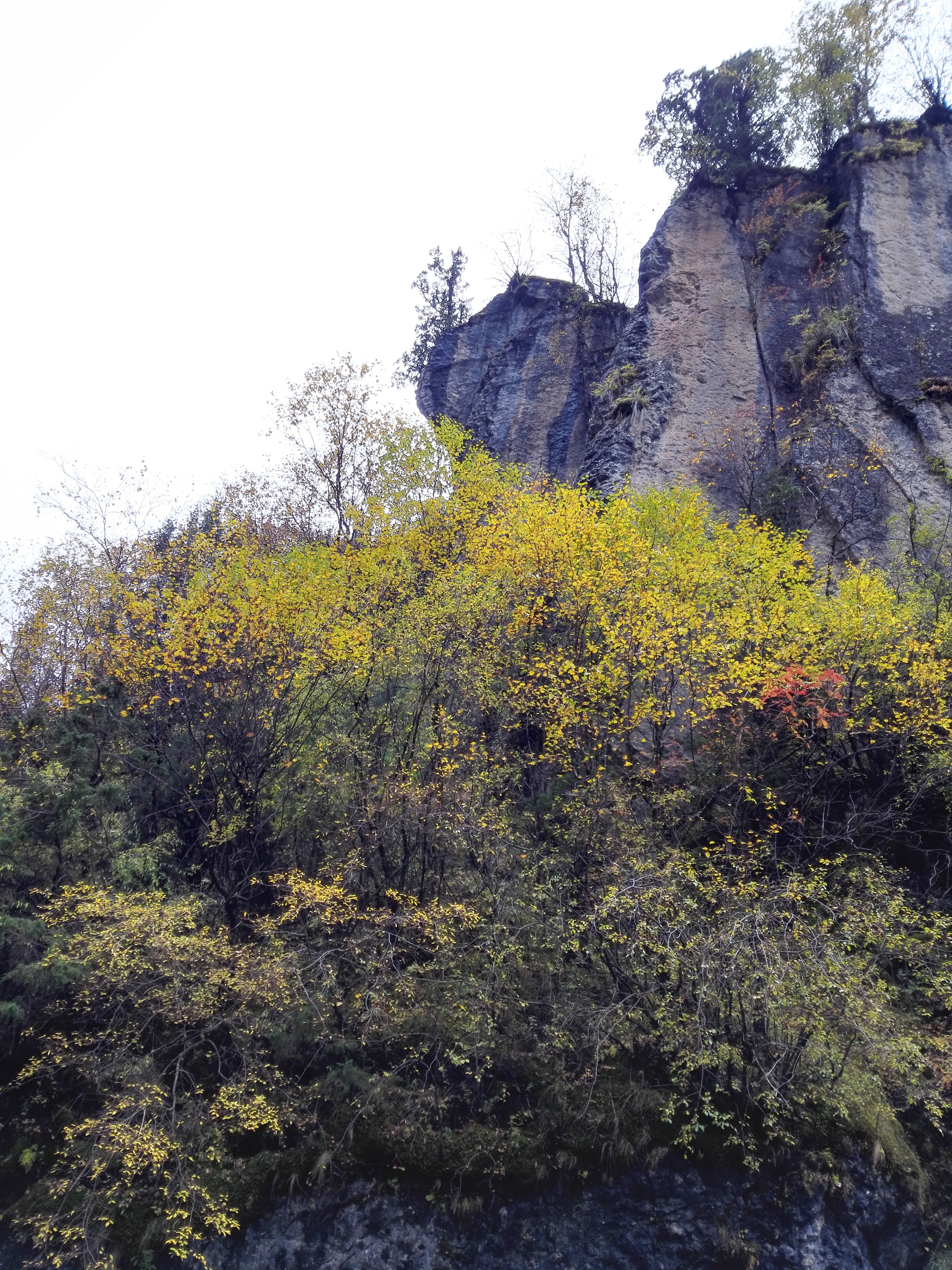 迭山山脉,是喜马拉雅造山运动的产物,地块抬升后,经流水侵蚀、风雨剥蚀,形成了大面积的硅灰岩石林。走在峡谷中,举目所见,峭峰林立,骨相苍然,千姿百态,有状如猛兽之凶险,有形如魑魅之狰狞,也有态如老叟之慈祥,光怪陆离,不一而足,让人见之,惊悚不已,难怪俗有“阎王殿”之称。而危岩绝壁上青黄点染,崖壁肌理分明,峥嵘苍劲,山石树木浑然天成,俨然一帧帧笔法古朴的山水画,这自然造化却又让人拍案叫绝,神为之驰。此时正是金秋十月,山谷里色彩缤纷,一道清泉淙淙,自山上奔流而下,溪涧里乱石散落,水过跌宕飞花。坐溪边石上歇息,深吸一口无尘无垢的清新空气,掬一捧清透冰凉的雪山之水,静听高原上山岚吹动经幡的清妙梵音,此刻,所有的疲惫都被忘却,山外的红尘俗世都被忘却,只觉心境空明,物我两忘。