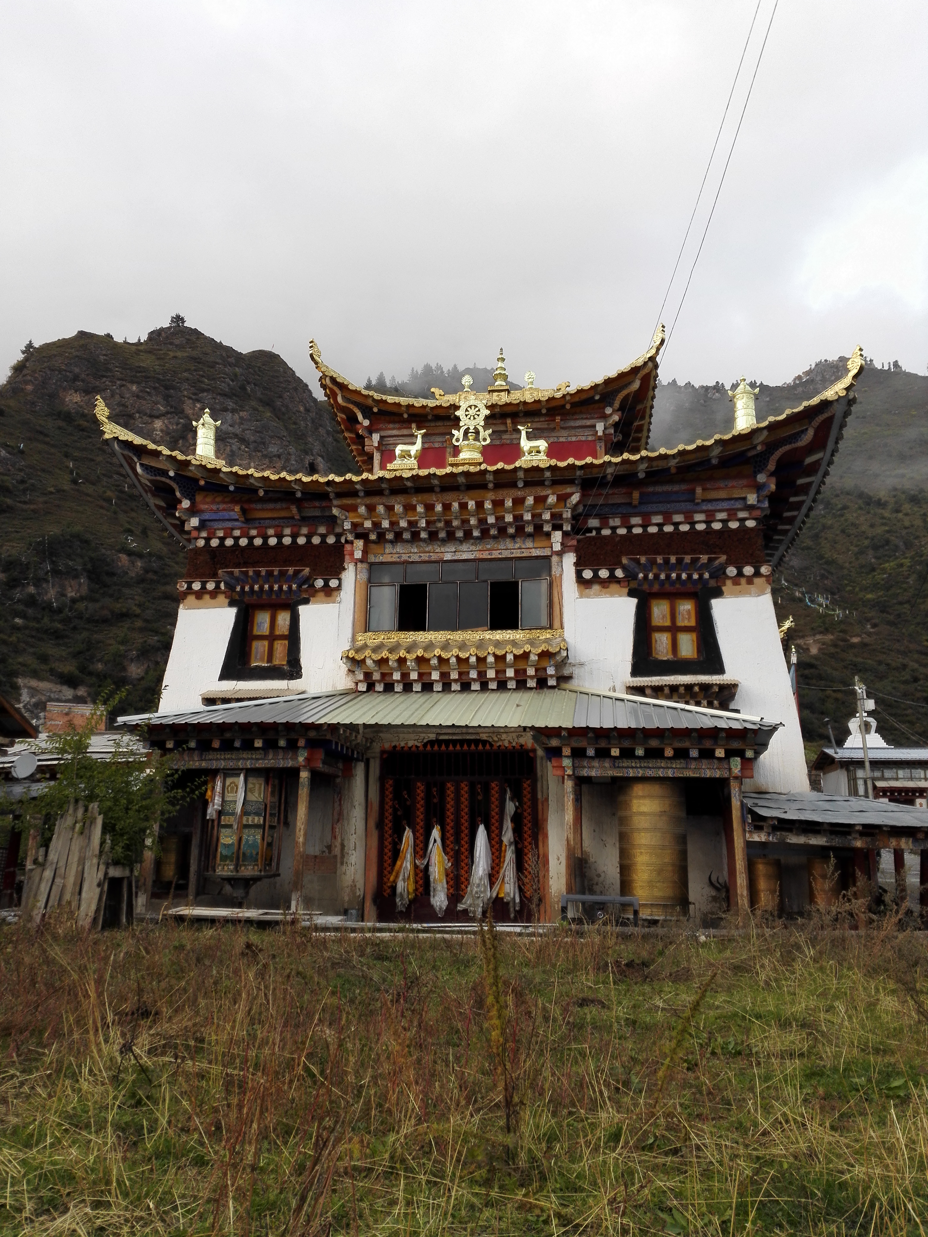 “靠山边栖息着一座寺院叫拉桑寺,在它下面是迭部人的村庄,房子挨着房子,还有小麦和青稞的梯田,在所有这些的后面,就是巨大的石灰岩山,郁郁葱葱的云杉和冷杉布满峡谷和坡地。”站在拉桑寺前的悬崖边上,整个扎尕那尽收眼底,脚下,就是洛克所描写的情景,只是小麦和青稞已经收割了,坡上是一块块已翻整过的泥田。而待到油菜花开,青稞成熟,金黄一片,映着蓝天白云,那景色定是绝美。