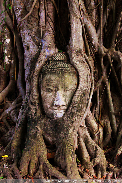 并排矗立的三座佛塔(stupas)之一 玛哈泰寺 玛哈泰寺在大城没落之后被森林所包围并侵蚀,其结果造就了该寺参观人数最多的佛像:佛像的头部被参绕在盘旋的树根中。在泰国佛教里面,这种圣像与大自然纠缠在一起的现象是极其幸运的兆头。