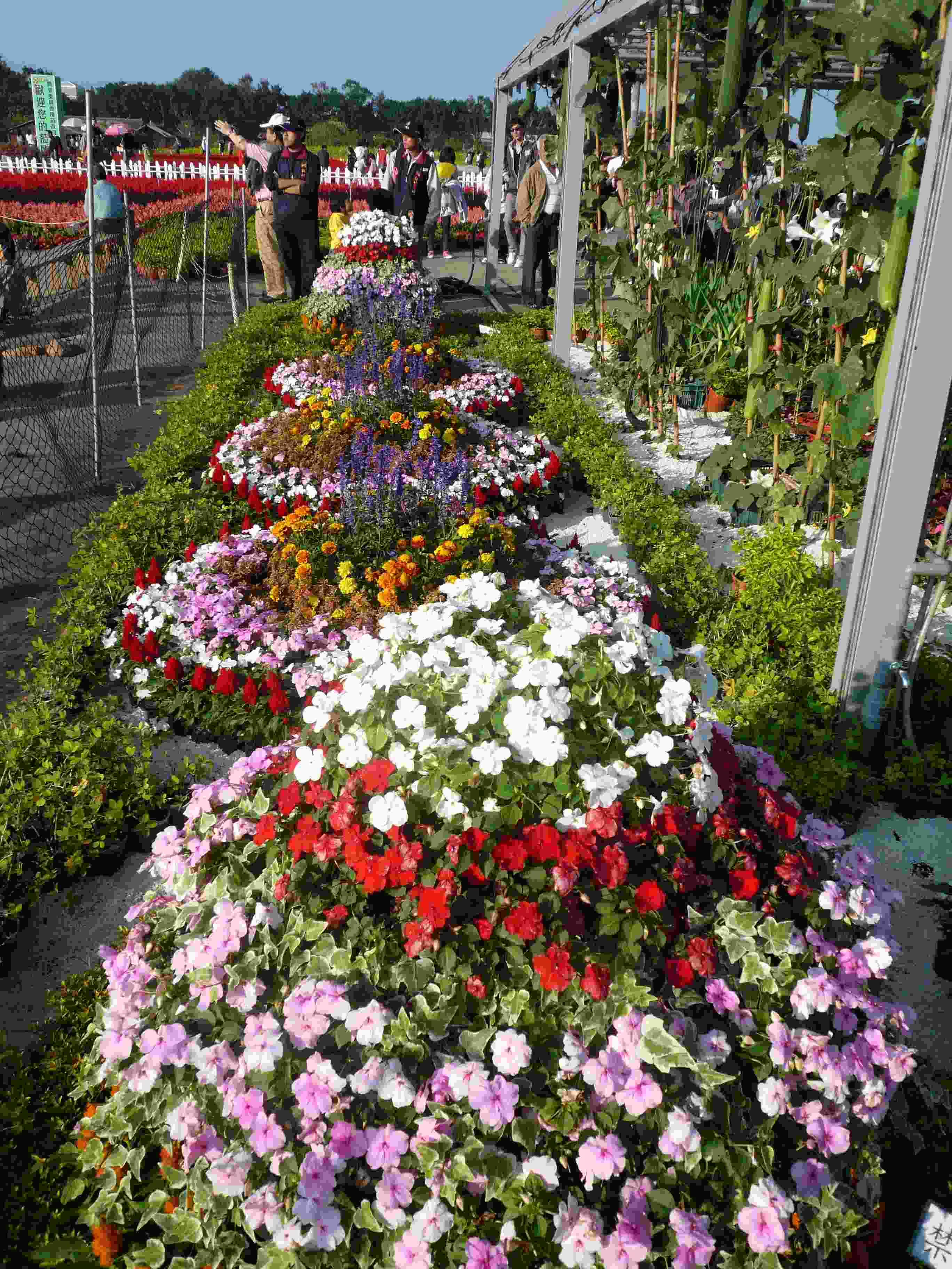 在花海中间的展示区,主办方还设了若干个小展棚,比如说,种子艺术馆、生活绿美化等等,游客们要是赏花累了,大可以上岸休憩片刻,不仅可以学习到有关花卉的知识还可以品尝到当地的美食,一举两得。还有各种精心修饰的花圃,各种花儿被巧妙地组合成不同的造型,有让人眼馋的蛋糕、喜庆的花柱也有宏伟的花墙……