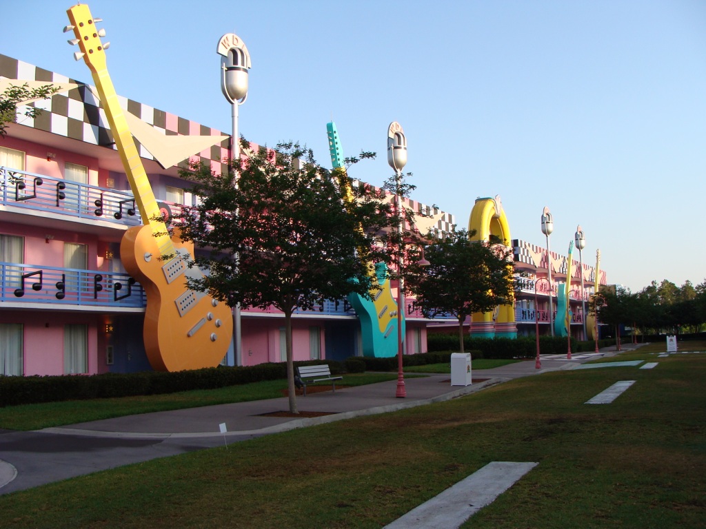 比如,最富迪斯尼元素的全明星酒店(All Star Resort)就非常令人流连忘返。全明星酒店有三个主题,分别是电影、音乐和体育,不同的主题酒店蕴含着不同的创意理念与设计元素。比如All Star Music就是一座由爵士帽、手杖和五线谱构成的别致的三层小楼。小楼不高,但楼内设施齐备。每个房间里都布置了各具特色的卡通布景,配合着那梦幻般的灯光,你会“真实地”感受到梦幻童话的存在。当然,每个主题酒店里还配有一座由群星元素构成的餐饮中心和购物中心。在餐饮中心里,你可以尽情享受各种西餐美食;在购物中心,你可以购买从明信片到钥匙扣等各色各样的迪斯尼纪念品。不过,这些纪念品几乎都是Made in China(中国制造)啊!