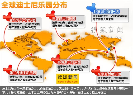 目前,美国加州、佛罗里达州,法国巴黎,日本东京和香港5处地方建有迪斯尼乐园。其中,资格最老的是加尼福利亚的洛杉矶迪斯尼乐园。在五大乐园中,位于美国佛罗里达州奥兰多的迪斯尼面积最大,有12,228公顷(相当于124平方公里,几乎等于7个广州大学城小谷围部分,为新加坡国土面积的1/5),香港迪斯尼乐园最小,占地126公顷,为奥兰多迪斯尼的百分之一。其次是位于巴黎马恩河谷的迪斯尼,面积1951公顷,有“迪斯尼乐园”和“沃尔特迪斯尼影城”两个主题公园;洛杉矶迪斯尼为206公顷,拥有传统的“迪斯尼乐园”和“加州冒险乐园”;东京迪斯尼面积为201公顷,有“迪斯尼乐园”和“迪斯尼海上乐园”两个主题乐园。