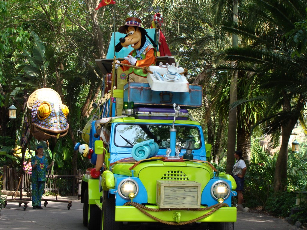 下午四点左右,主角“动物”游行开始,以米老鼠为代表的各类“动物”纷纷出现在园中的道路上。这是迪斯尼动画主角的大展示,以不同的形式向游客展现风采,有坐在车上的,也有被安上轮子的。他们在演员的引导下,一路伴随着愉快的音乐且演且行,队伍超过一公里,时间长达1个小时。
