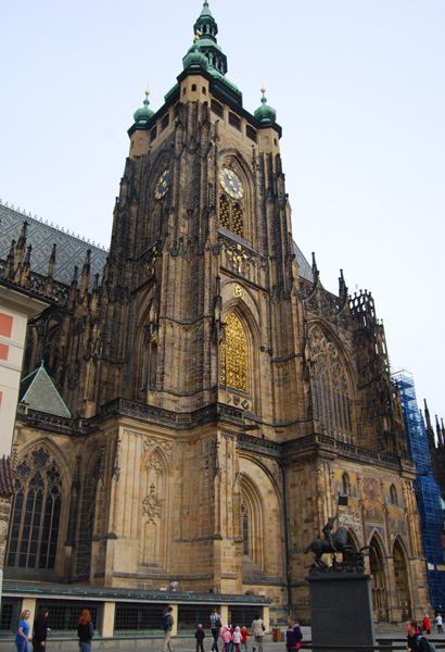 圣维特大教堂,位于布拉格城堡内,非常宏伟,颇有气魄,灰黑色的哥特式建筑高耸入云。教堂经过3次扩建,于1929年正式完工。布拉格王室的加冤仪式在此举行,以往王室的遗体也安葬于此,这里还保存着国王的王冠和加冕用的权杖等。