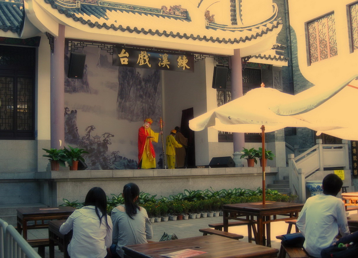 旧时的娱乐,以唱戏为主,现在上演的虽然是现代版的大话西游,然而坐下来品尝著名的西关小吃,却也别有一番风味。