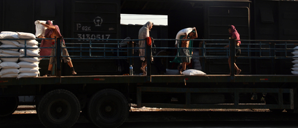 沿着白色的土灰墙,有一条黑色的铁轨,铁轨上停卧了一列货车。那些粗狂的男人赤裸着上身,头披一块粗布,奋力地卸货。汗水冲泻了他们全身,在太阳底下油亮亮地发着光。