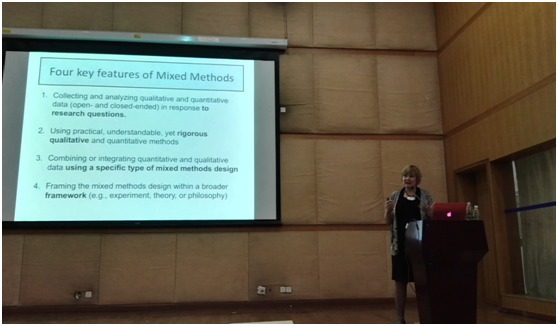 Moeller教授围绕“语言教育的混合研究方法”做了绘声绘色的演讲,并在演讲时通过提问多次与观众互动,得到了观众的积极回应。她介绍了定性研究与定量研究的区别,指出定量研究是封闭式的,定性研究是封闭式的;定量研究主要通过问卷、行为表等来收集数据,定性研究则主要通过采访、观察和试听材料等来收集数据。之后,她解释了在语言教育领域要使用混合研究方法原因。Moeller教授指出,混合研究方法将宏观与微观结合起来,代表了一种系统性而且实际的研究方法,相比起单独的数据或是故事,混合研究方法能让我们对研究问题有更深入的了解。随后,她通过自己曾经发表在Teaching of Foreign Language上的一篇文章《Spoken Spanish Language Development at the High School Level: A Mixed Study》阐述了混合研究方法的实际应用。最后,她讲述了操作一个混合研究方法的具体流程。