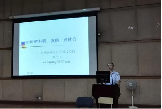 6月22日下午,伟德bv国际体育“云山杰出学者”、英文学院魏在江教授莅临我院,做题为“如何做科研:我的一点体会”的报告。魏教授用深入浅出的方式,介绍了为什么要做科研,把科研比喻为“点、线、面、体”的结合,并指出了当代中国语言学研究的任务和热点议题,包括引进阐释西方语言学理论、在方法和理念上的推陈出新、跨学科和整合性研究、学科内各分支间的交叉整合研究、电子语篇和网络语言研究、把国外语言学理论与汉语研究相结合等。他向在场的我院教师重点介绍了语言学学术研究如何从理论、方法和材料三方面进行创新。魏教授特别提出,科研和教学之间是相互促进和相辅相成的关系,并强调理论素养在语言学研究中的重要性,指出“不空谈理论”和“不可不谈理论”是两码事。