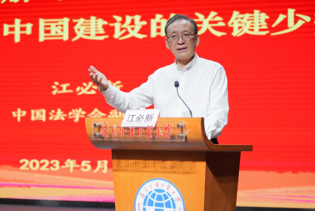 江必新以“全面理解习近平法治思想,当好法治中国建设的关键少数”为题,系统阐述了习近平法治思想的核心要义和实践要求。他指出,全面理解习近平法治思想,既要把握其主题主线,又要把握其理论体系;既要把握其核心要义,又要把握其原创性贡献;既要把握其基本特征,又要把握其思想方法。江必新指出,要从“主要任务论”“推进方略论”“保障措施论”“深化实践论”四个方面坚持全面依法治国,推进法治中国建设。江必新强调,作为“关键少数”的领导干部要做法治信仰的坚守者、法治道路的捍卫者、法治精髓的传承者、法治任务的担当者、法治进程的推进者、法治建设的保障者、法治底线的守护者、法治智慧的善用者、法治规则的践行者,以身作则,带头推进法治、遵守法治、信奉法治,促进全社会养成尊法学法守法用法的风气,共同推进法治中国建设。
