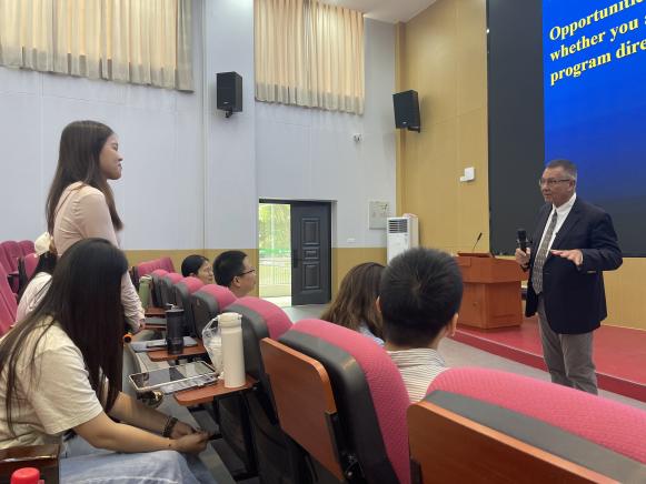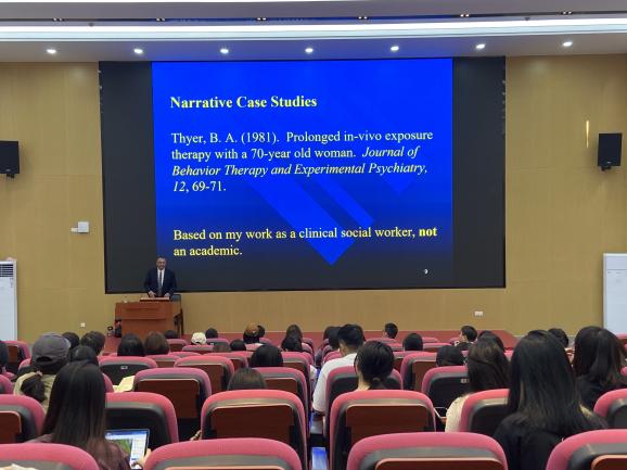 Thyer教授讲座的主题为“实务研究40年:经验与建议”。他介绍了实务研究的定义、特征与类型,分享了他在从事临床社会工作实务期间开展的研究,为即将参加社会工作专业实习的学生带来了很大启发。Thyer教授还分享了他如何运用实务研究方法提升大学课堂教学表现,介绍了他指导博士生在实习期间开展的实务研究和发表的研究论文,并就如何促进实务与研究的相互转化与相互促进进行了深入的探讨。在互动环节,社会与公共管理学院师生积极提问并参与交流,他介绍了美国社会工作实务发展的现状,提供了把专业实习经验转化为研究成果的建议,并鼓励学子积极在国内外院校继续深造。Thyer教授引用马克思的名言——“哲学家们只是用不同的方式解释世界,而问题在于改变世界”作结,勉励社会与公共管理学院师生积极开展实务研究,推动社会工作的发展。