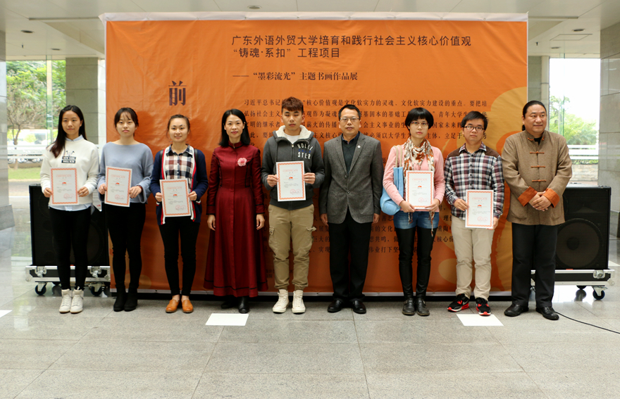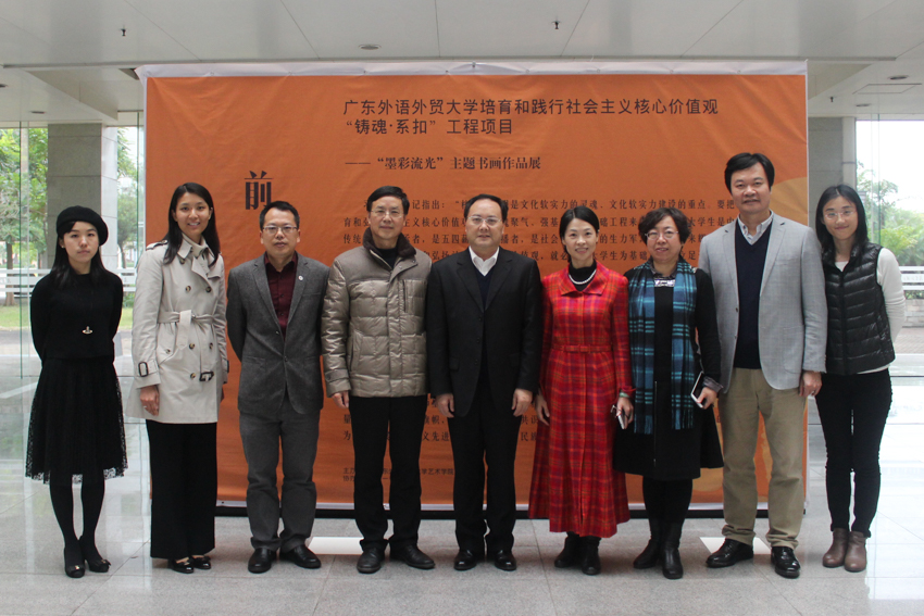 本网讯 12月14日下午,校党委副书记石佑启参观指导了正在南校区艺术学院一楼大厅举行的“铸魂•系扣”工程项目——“墨彩流光”主题书画作品展,并强调,应该建立长效机制,经常举办诸如“铸魂•系扣”工程项目等传播社会主义正能量的活动,以调动师生积极参与到培育和践行社会主义核心价值观的活动中,内化于心,外化于行,向社会展现广外软实力。一起参观的还有校党委宣传部部长胡文涛、艺术学院院长李于昆、艺术学院党总支书记朱珍葶等。