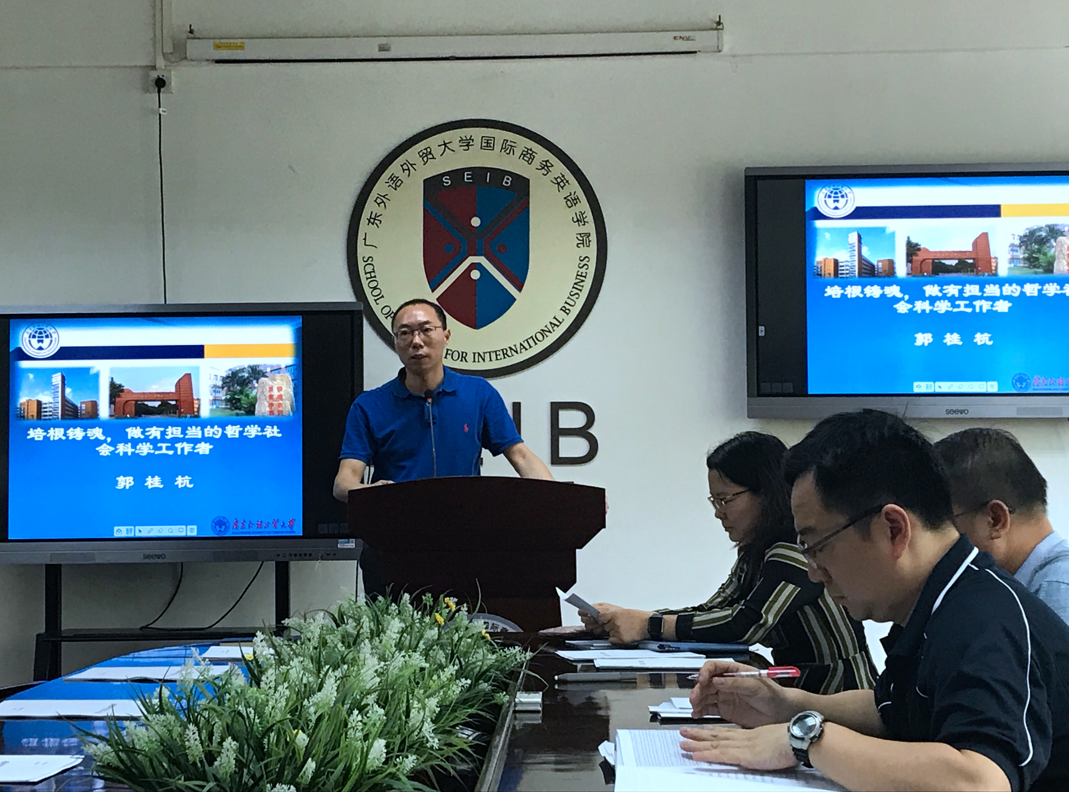 会上,商英学院院长郭桂杭做题为《培根铸魂,做有担当的哲学社会科学工作者》的专题思政宣讲。他结合自己3月份参加中组部等六部委联合举办的哲学社会科学教学科研骨干研修班的经历,围绕课程体系、学习内容、学习要求等,与大家分享了本次研修班的基本情况;并辅以照片、影音资料等汇报了在井冈山干部学院的体验式学习收获。