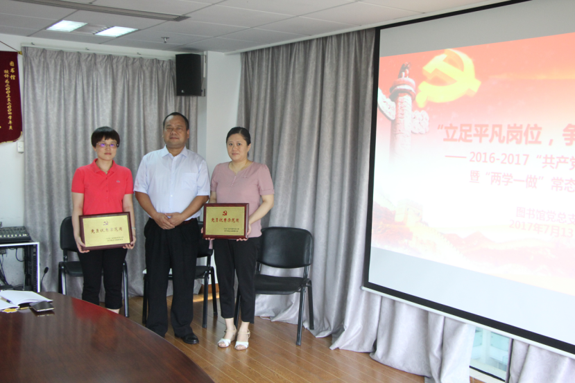 馆长孔晓明宣读了《关于表彰2016-2017共产党员示范岗的决定》,获得共产党员示范岗的是“南校管理部服务示范岗”和“文献建设部服务示范岗”,获得共产党员示范岗服务标兵的是胡晓明、周汇辉、廖东昇、白丽英、赵莉莉、王悦、李宛馨等7位同志。孔晓明在发言中指出,党的理论要与实际工作相结合,要建设有实力、有特色、有情怀的图书馆,而特别强调有情怀就是不能以个人得失来衡量自己的工作,要有担当讲奉献。