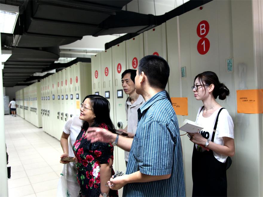 随后,档案馆全体成员来到开放日活动的库房展示区进行学习参观。馆舍功能齐全,设施完备,配备有防雷系统、红外线自动报警系统、恒温恒湿系统和高压细水雾消防系统等安全防护设备,以确保档案实体和档案信息安全。进入参观的B区档案库房,单个库房面积就有500平方米,主要用来放置财会和实物档案,财会库房宽敞明亮,全部安装了先进的现代化密集架,信息技术部的刘老师还详细演示了遥控开启自动化密集架的全过程。实物展示库房也布置有序,有独立的中央空调保证恒温恒湿,每一件重要实物都制作了独立标识并有玻璃柜专门放置。此外,全体成员参观了中大档案馆的监督指导部和先进的档案信息系统,馆长助理兼监督指导部主任许凌介绍了部门立卷指导的方法和过程。