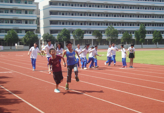 本网讯 7月19日上午,寮步晴空万里,这是“GTL寮中夏令营”开营以来难得的好天气。在这个温暖宜人的日子,英文学院“GTL三下乡服务队”在寮步中学大操场举办了趣味运动会,80多名学生参与了“过河拆桥”、“两人三足接力”和“心心相印”三个游戏,现场气氛十分活跃。这一活动既让同学们舒缓了心情,又增进了师生间的情谊。