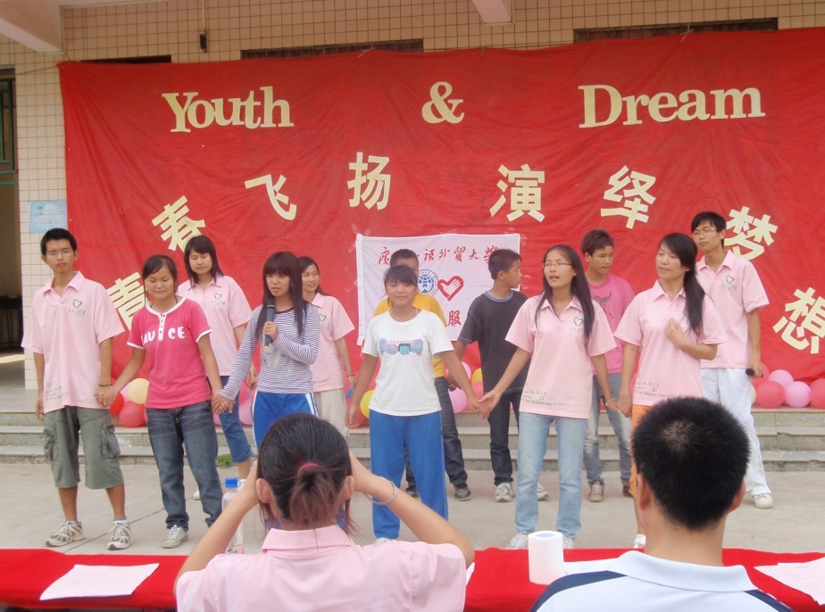 总结会之后,汇报表演正式拉开帷幕。八个精彩的节目不仅展示了义教工作的成果,也展示了学生在义教活动中所提高的综合能力。信息自强队队歌《乡旅》的展示让在场观众都感受到了队员们渴望下乡的激情和在下乡过程中同甘共苦的团结精神。在英文诗歌朗诵、英文绕口令和英文戏曲表演中,学生们的自信和流利的英语表达能力让台下的观众赞叹不已。一首由《北京欢迎你》改编的《广州欢迎你》不仅结合了时代的主题,同时也道出了身为东道主的广东同胞对即将到来的广州亚运会的期待之情。最后,一曲《朋友》将台上台下连接在了一起。为时一个小时的汇报表演暨总结大会圆满闭幕。