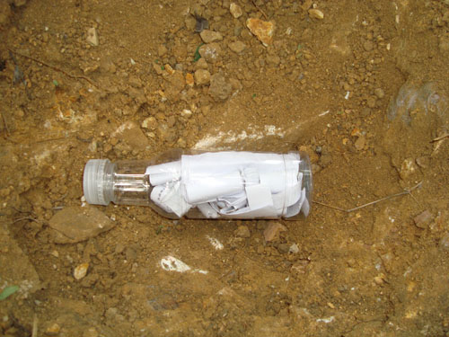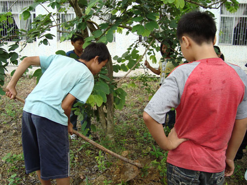 同一天上午,在五年级的语文课上,老师带领同学们扛起锄头,到学校后院的大树下挖坑。坑挖好后,一位男生小心翼翼地把许愿瓶放入坑中,然后填土,埋好满载每位同学梦想的许愿瓶。