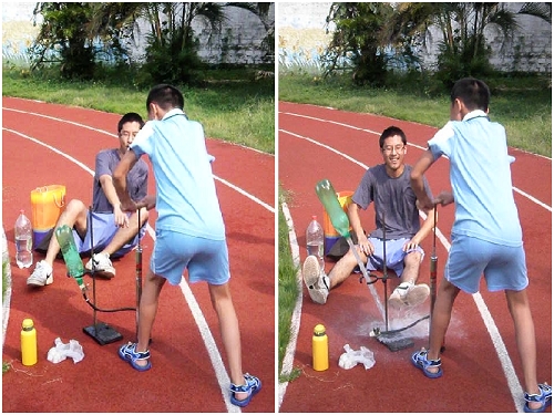 老黄(孩子对柏雄的称呼)将装满教学物品的袋子往教室的桌子上一放,孩子都睁大了眼睛,不停地问老黄上课的内容。考虑到孩子们的接受能力,激发孩子对科普知识的兴趣,老黄由“神六、神七”引入,结合图文生动地解释“水火箭”发射的原理。制作与发射“水火箭”的材料其实非常简单,只需汽水瓶、打气筒、铁支架、橡胶塞、气针各一个。发射方法也很简单:首先往瓶子加入大约1/3的水;将橡胶塞子紧紧塞住;插入气针;将瓶子安置在铁支架上;使劲用气筒通过气针向瓶子里打气,直到气体冲开塞子,这样瓶身就能一飞冲天。老黄深入浅出,一步步讲解“水火箭”诞生的全过程——“不断往瓶里充气,塞子终于撑不住了就会脱离瓶子,瓶里的空气往下跑会给瓶子一个向上的冲力,然后空瓶子就可以升空了。”