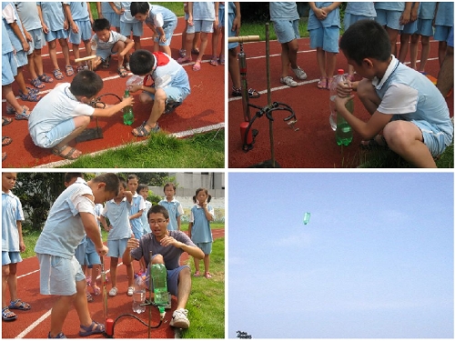 老黄一解释完原理,孩子们就欢呼雀跃地飞奔向了操场,他们都拼命往老黄身边挤,想率先做这个新奇的试验。在老黄的指导下,学生们将每个步骤完成得非常顺利。“打气要打快点,大力点!” “嘭!”绿瓶子迅猛飞上蓝天。“哇,哇,哇……”惊叹声不绝于耳。孩子们迫不及待地要求再做一遍。孩子们总共试验了六次,每次绿瓶子都能在一遍遍的称赞声中划过蓝天。
