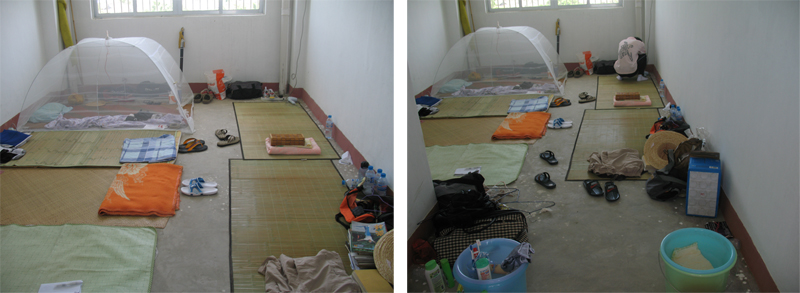 虽然宿舍没有床,队员们却毫无怨言。他们将地面清洗干净,铺上几张薄薄的草席为床。
