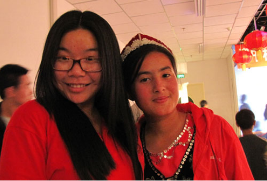 冯卓怡(前左)和儿童福利院的维吾尔族孩子在一起