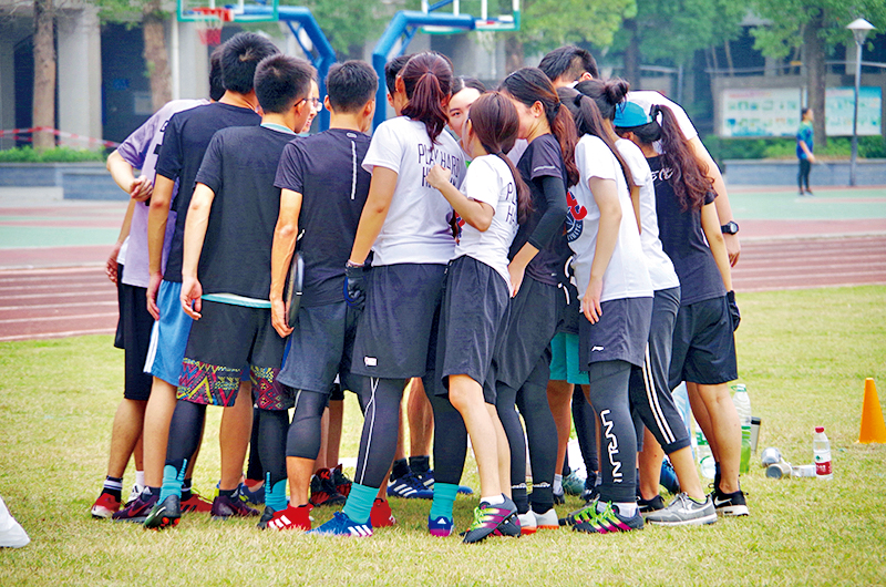飞盘社社员们赛前互相加油鼓劲