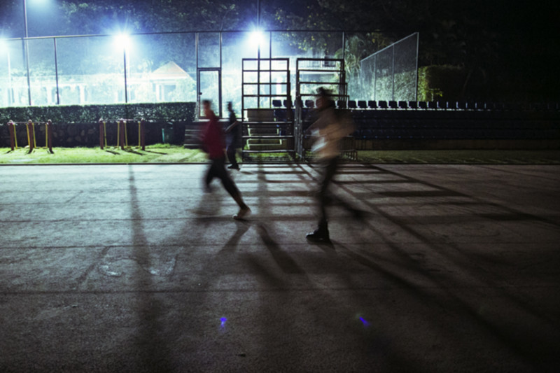 远远看见,似乎有两个身影正在缓慢地移动。走近一些,穿着休闲服装的小宜和小力正一边慢跑,一边低声说着什么。他们一圈一圈地跑着,仿佛不知疲倦。“其实我也是第一次深夜跑步”,小宜解释道,“小力是我的舍友,宿舍断电了,他今天心情也不太好,我便陪他出来跑步散散心。”