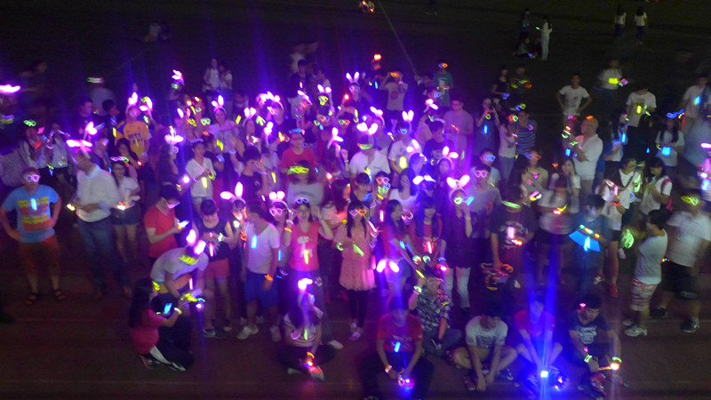 广外NowRun跑步协会的副会美凤最初组织荧光夜跑的目的是号召更多大学生关注运动尤其是夜跑,让他们暂别网络,走出宿舍,投入大自然。当看见公路和操场一片片色彩斑斓的荧光海洋时,她感觉到荧光夜跑是一场无关速度,有关尽兴的狂欢。现场,五颜六色的荧光棒、手指灯、泡沫管、荧光贴纸与牛角灯交相辉映,前来参与夜跑的千余学生成为夜晚的主角。