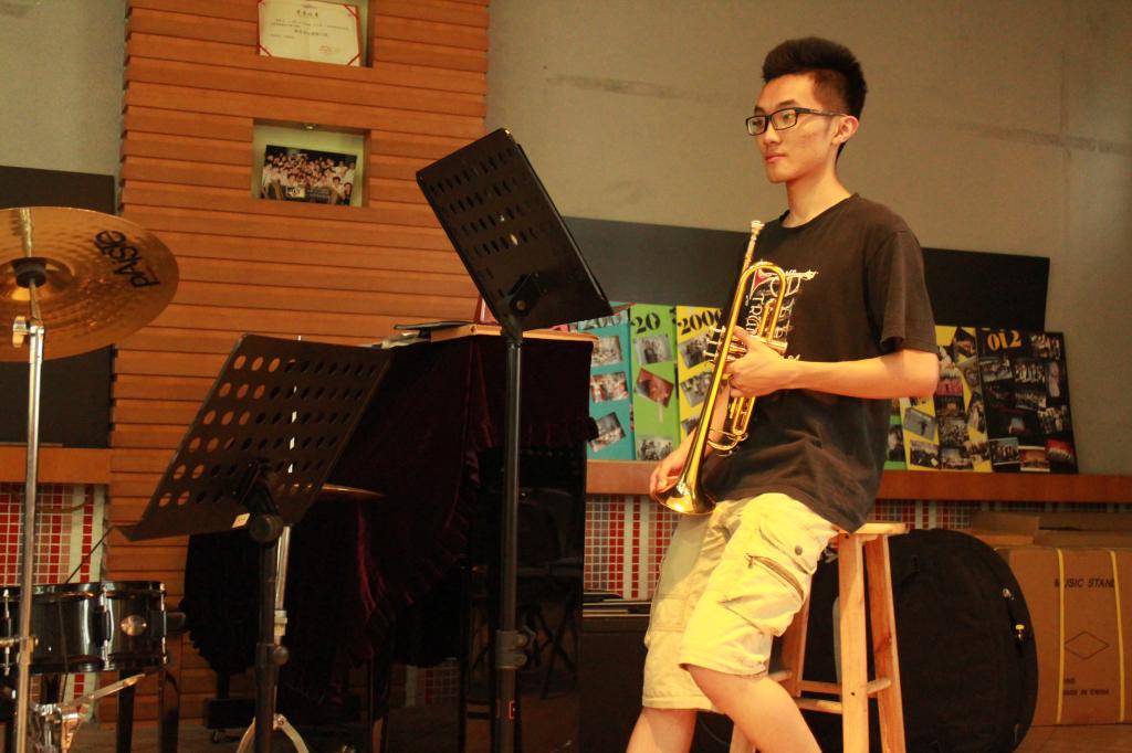 相比于用来弹奏的手风琴,小号是个声音嘹亮而清脆的吹奏乐器。修长的身躯,铁铮铮的外壳,不仅可以演奏出振奋人心的旋律,还能够演奏抒情的优美乐段。因此无论是交响乐团还是军乐团或者爵士乐团,它都是常见的乐器。现任校管乐团团长张顺便是吹小号的高手。