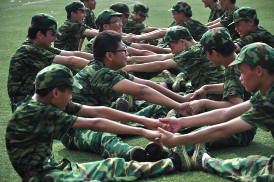 在男生中则上演了一场 “超级反恐表演”,他们在一挡一推中克敌制胜。干硬的草皮摸上去已经很扎手,不幸的“敌人”在教官的口令下,一次次毫不犹豫地“倒”在上面。“利草”瞬间刺痛神经、瘙痒如芒在背却不能用手挠。休息时,记者轻拍他们的肩膀加油,没想到这轻轻一拍,溅起水花无数,黝黑的新生们都咧开嘴大笑起来。