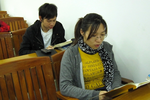 在南校区就读了两年后搬到了北校区、商英学院的小吴说:“语言的学习大都靠自觉。学语言的孩子很多都是很刻苦的,晨读当然也是必不可少的学习过程。不仅晨读,北校的晚读也是很有名的。很多人夜自修完了以后还要去二教晚读,晚上十点多了,二教还是书声朗朗的,久而久之,任何一个人都会受到这种气氛感染的。我就发现我们班的同学自从搬到北校之后变得勤奋多了。”