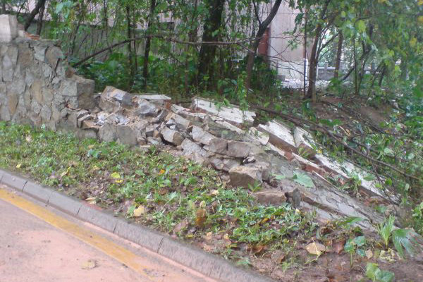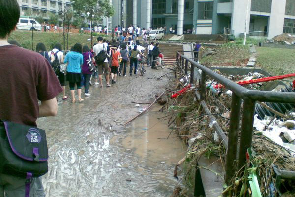 而白云山脚下的广外北校区,也逃脱不了这场“天灾”。白云山出现近40处大小塌方,其中较大的滑坡有7处,为十余年白云山山体滑坡最为严重的一次。相思河摇身一变为“黄河”,第二天的校道上淤泥堆积,给师生们的出行带来极大的不便;62间学生宿舍被淹,受灾宿舍的学生彻夜未眠;大树被狂风连根拔起,校道旁的墙壁也被推倒。