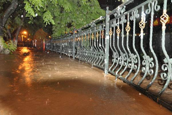 5月14日,暴雨再次夜袭广州。广外北校区的相思河水倒灌,水位空前提高,学校成了一个“大水池”,深可及膝;宿舍位于一楼的学生忙着扫掉门前的雨水,做好“防淹”准备。南校区也深受其害,水浸程度最严重的中行十字路口附近最高水位超过一米,过往行人和车辆纷纷小心翼翼地“涉水过关”。