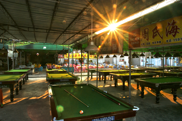 此时的的山顶没有晚上的热闹,在一面空墙上,挂着红底黄字的横幅,上面写着“迎亚运,创文明,坚决清理违规从事餐饮经营场所”几个醒目的大字。一些大排档却已经忙活起来,服务员有的忙着洗菜切肉,有的忙着铺台布摆桌椅的,准备中午的经营。