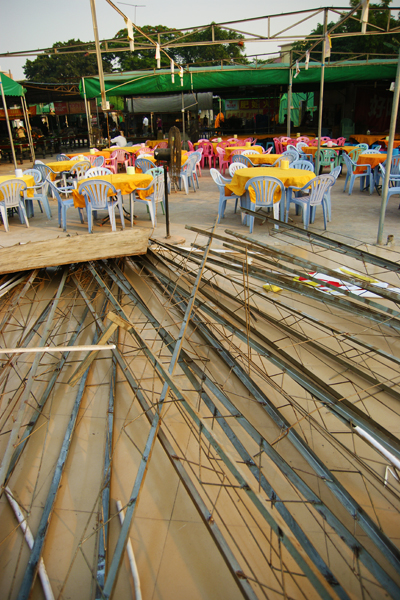地上的钢架,店铺里的座椅。生意,做到不能做为止