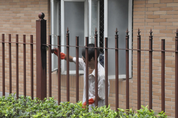 后勤工作人员为栏杆刷上新油漆