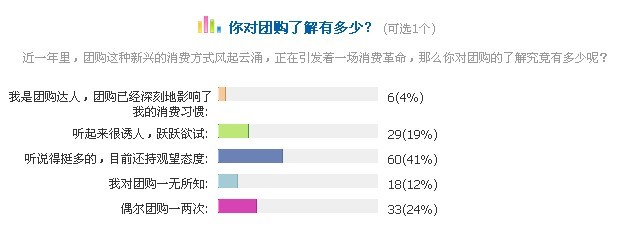 而在近两年里,团购以其具有低廉价格的优势,迅速吸引了社会中一部分精打细算的消费群体。暂时没有或较少收入来源的大学生,将会是团购的主力军。为了解团购在大学校园内的影响力,记者在网上发布了名为“你对团购了解有多少?”的调查,共有146人参与了本次调查。结果显示,对团购“听说得挺多,目前还持观望态度”所占比例最高,表示“偶尔团购一两次”其次,而认为自己是团购达人的并不多,甚至有12%对团购一无所知。目前看来,团购在大学生群体中没有真正流行起来,大多数人都持观望态度,选择等待团购行业成熟后再“出手”。